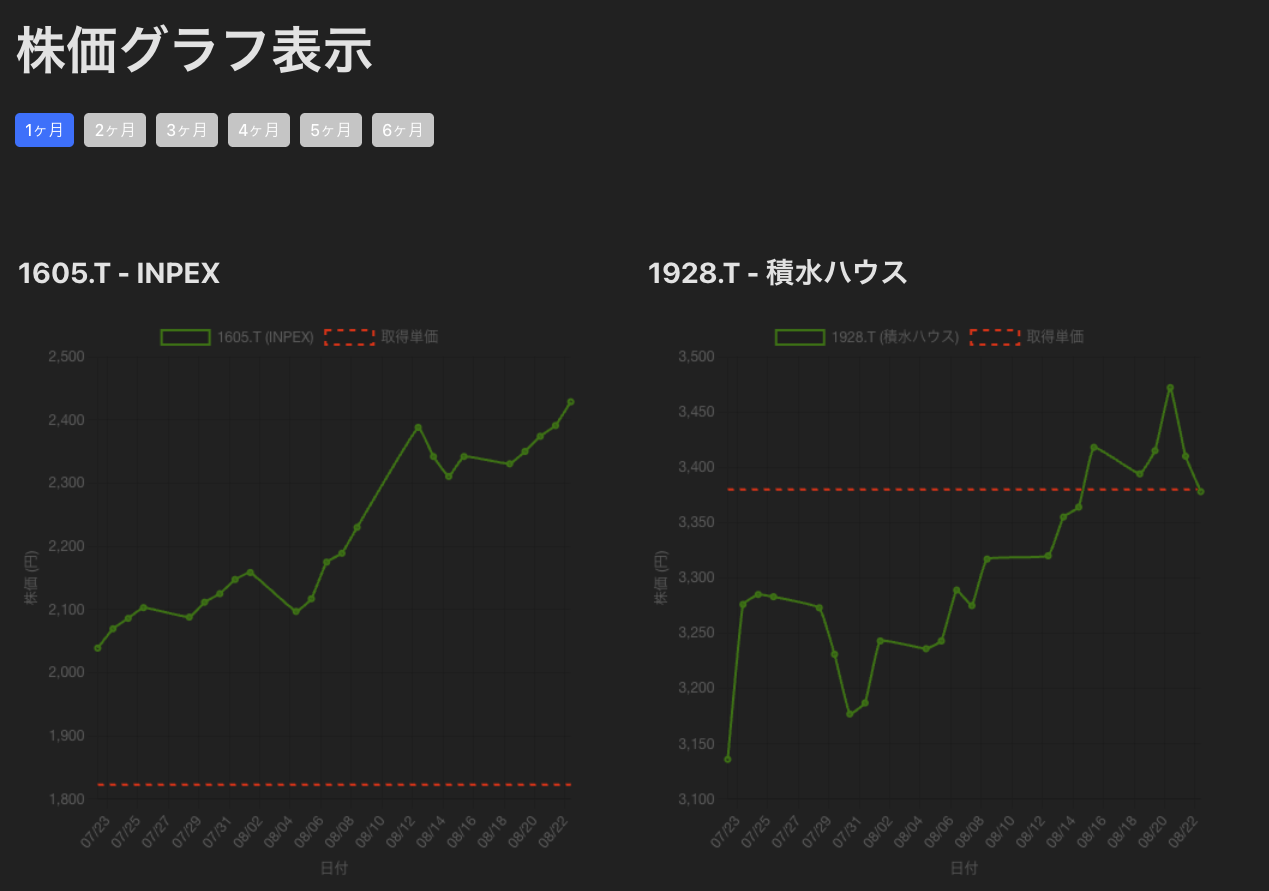ただ自身の取得単価については、取得するAPIがないため、サーバ側にあるtickers.txtにベタ書きです。株を購入した場合は、取得単価を手動で修正する必要があります。